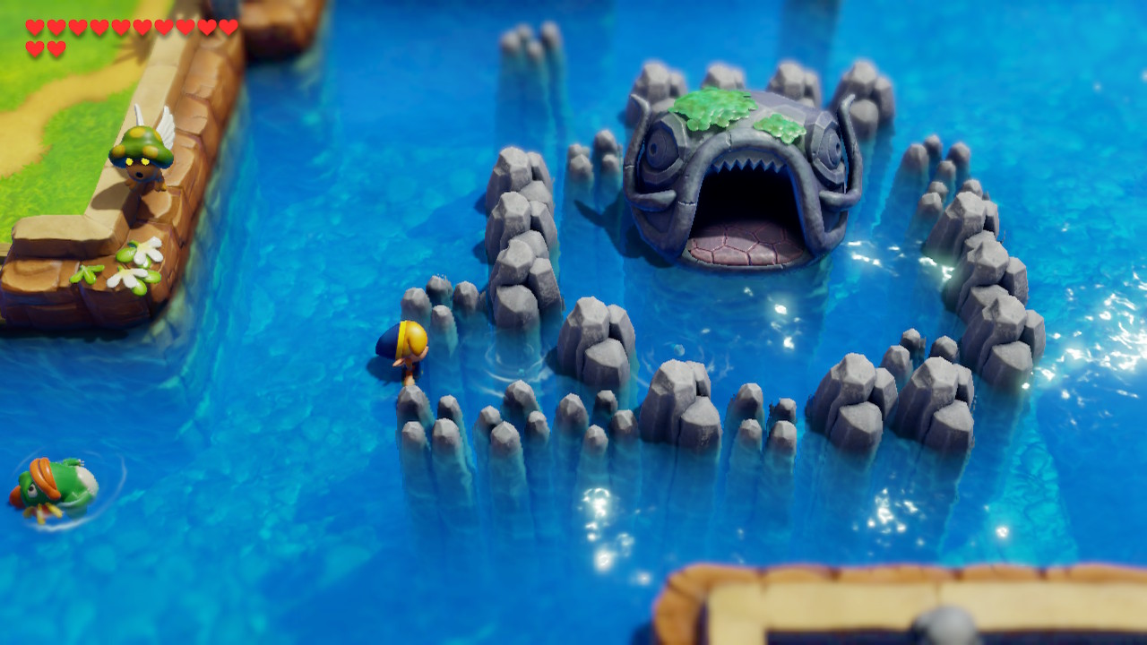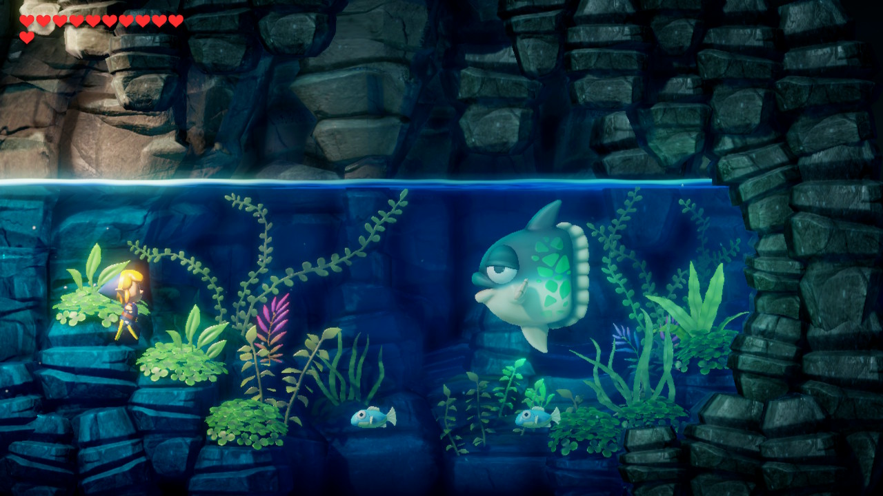 It's now time to head to the next dungeon. Backtrack and hop into the main body of water in Martha's Bay. You'll see the entrance to the dungeon here, but it's blocked off by rocks. There is an area you can swim in where you can see some bubbles. Dive here to enter into a 2D underwater area. Swim right and pop back up to get to the entrance of Catfish's Maw.