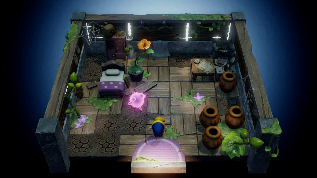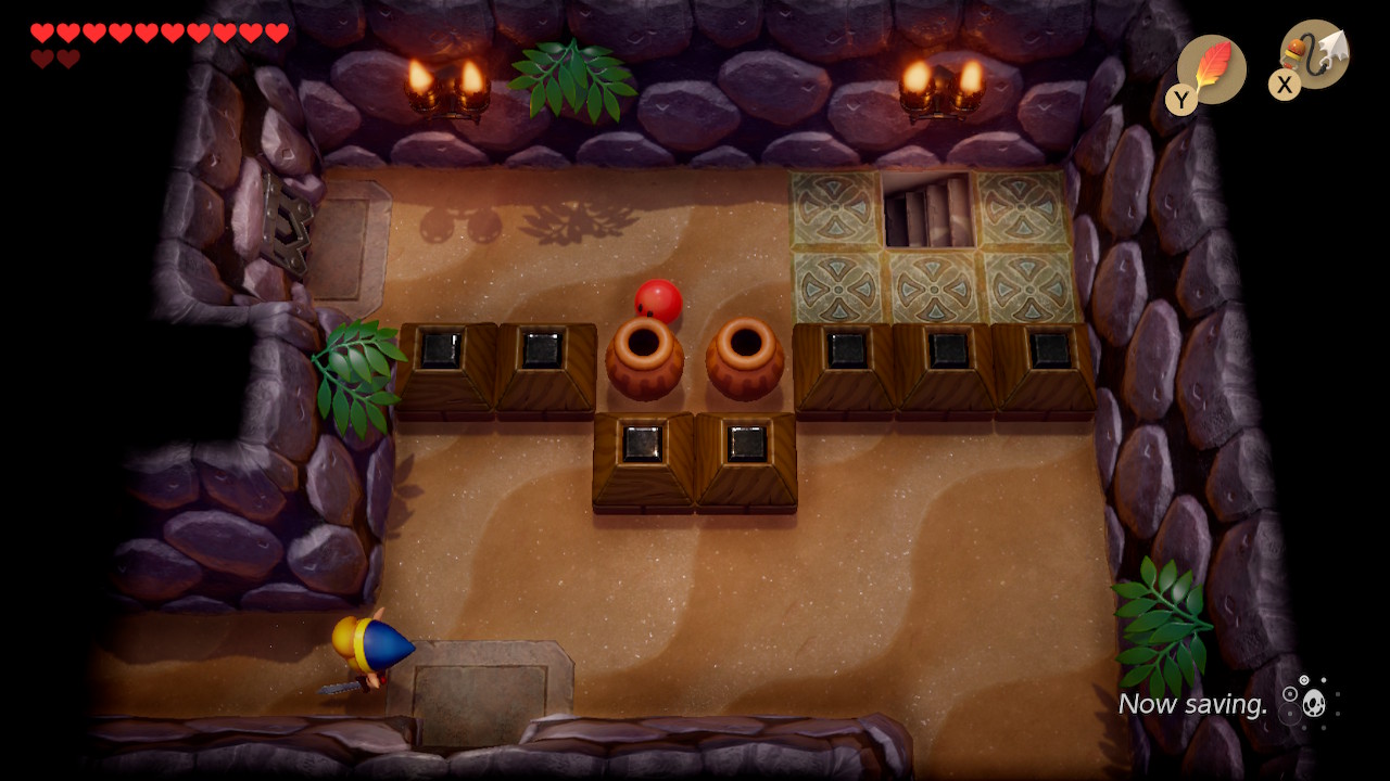 In this 2D area, head left and use your hookshot on the object above the two short ladders to make your way out of the basement. Use your small key on the block here and use your hookshot to make your way left. Whenever your ready, use your key and enter through the boss door.