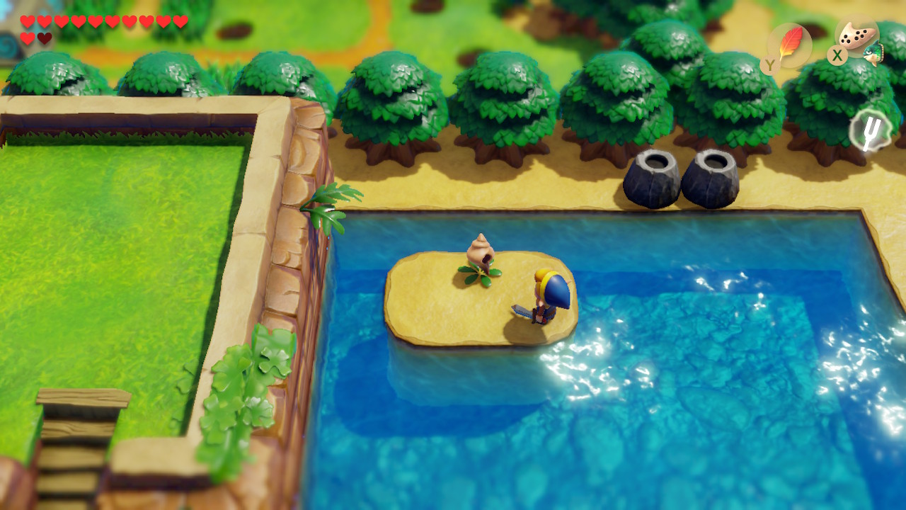 Just south of the phone booth, there's a place to hop into the water with a very small island. It contains a single bush. Go to it and slice it down to find Secret Seashell #36. Head east from here and you'll see a staircase on the other side of some pits and bushes. Use Roc's Feather plus the pegasus boots to jump accross and slice bushes. Go down the stairs and dive in the center of the water to get Piece of Heart #22.