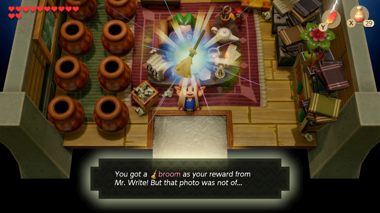 Head back south to Mabe Village. On the south side of town, speak to Grandma Yahoo standing outside the house with a purple roof. Trade her the broom for a Fishing Hook. Now, head back to the Trendy Game building to the east. You'll see Secret Seashell #34 is now up for grabs. Play the game until you get it.