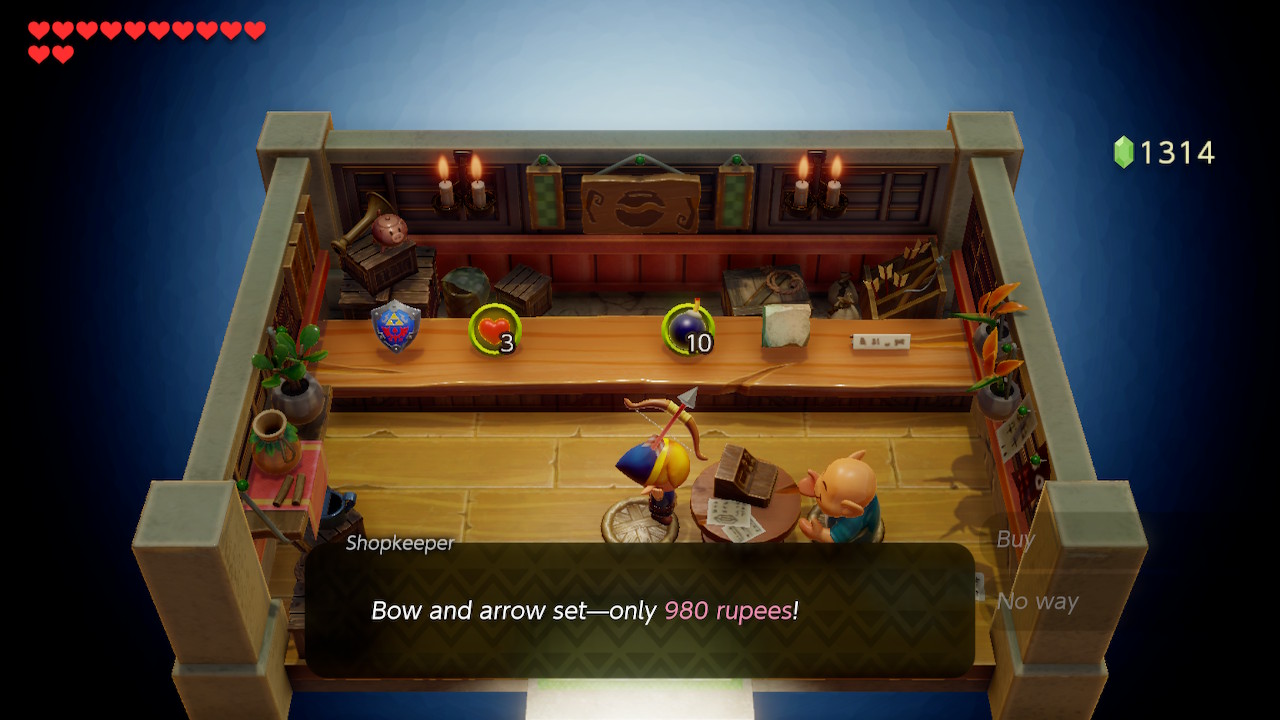 Now is a good time to purchase the bow from the shop in the village. It isn't necessarily required at this point, but you likely have enough rupees for it and it will allow us to access some optional rooms in the next dungeon. It'll cost you a whopping 980 rupees. You do have the option of stealing this item, but don't expect to ever be allowed in the shop again afterward.