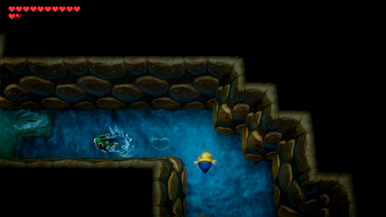 Now that we have the flippers, a lot has opened up for us in the overworld. From the entrance of Angler's Tunnel, swim east until you reach the entrance of a cave. Enter inside and dive down to collect Piece of Heart #18. Now swim back west past the entrance of the dungeon we just completed. There's a cave entrance decorated with two fish carvings. Enter this cave.