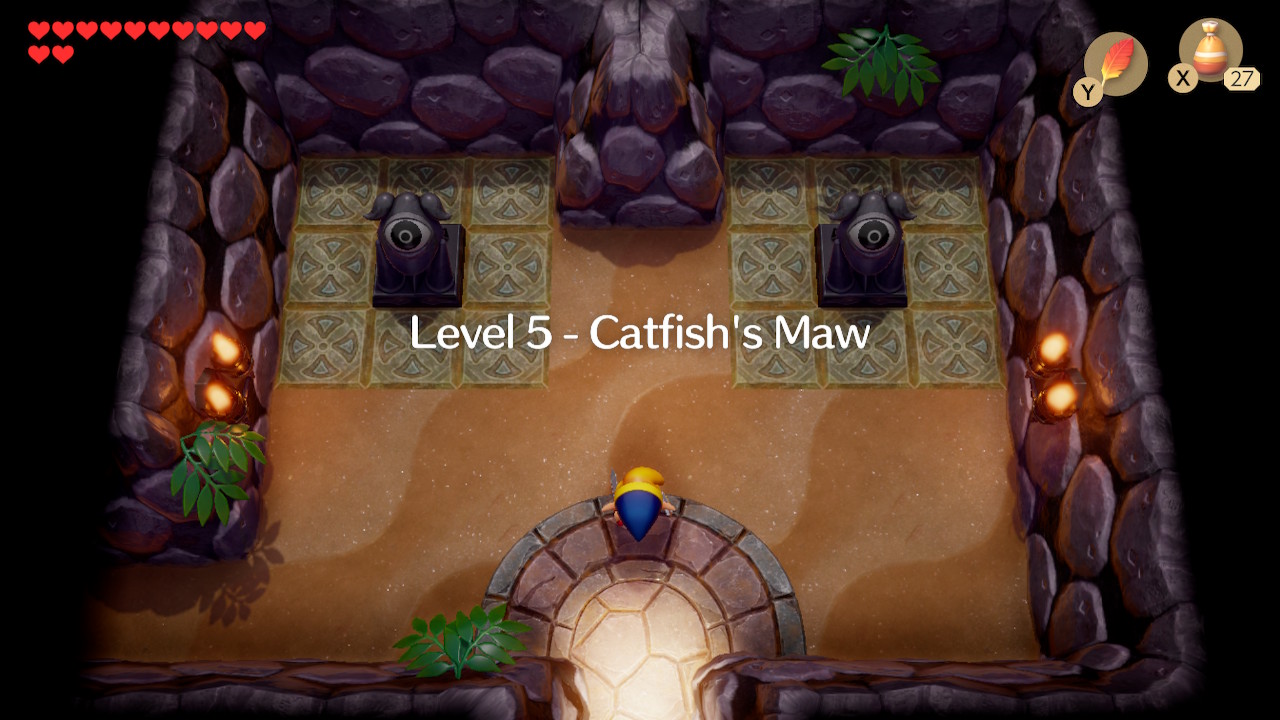 There's only one way to go after you enter Catfish's Maw: left. Defeat the enemies here if you wish and then head left another room. You'll need to defeat all the enemies in this room for the door to the left to open. Go through it to find a treasure chest containing the Compass. Head down the stairs in this room.