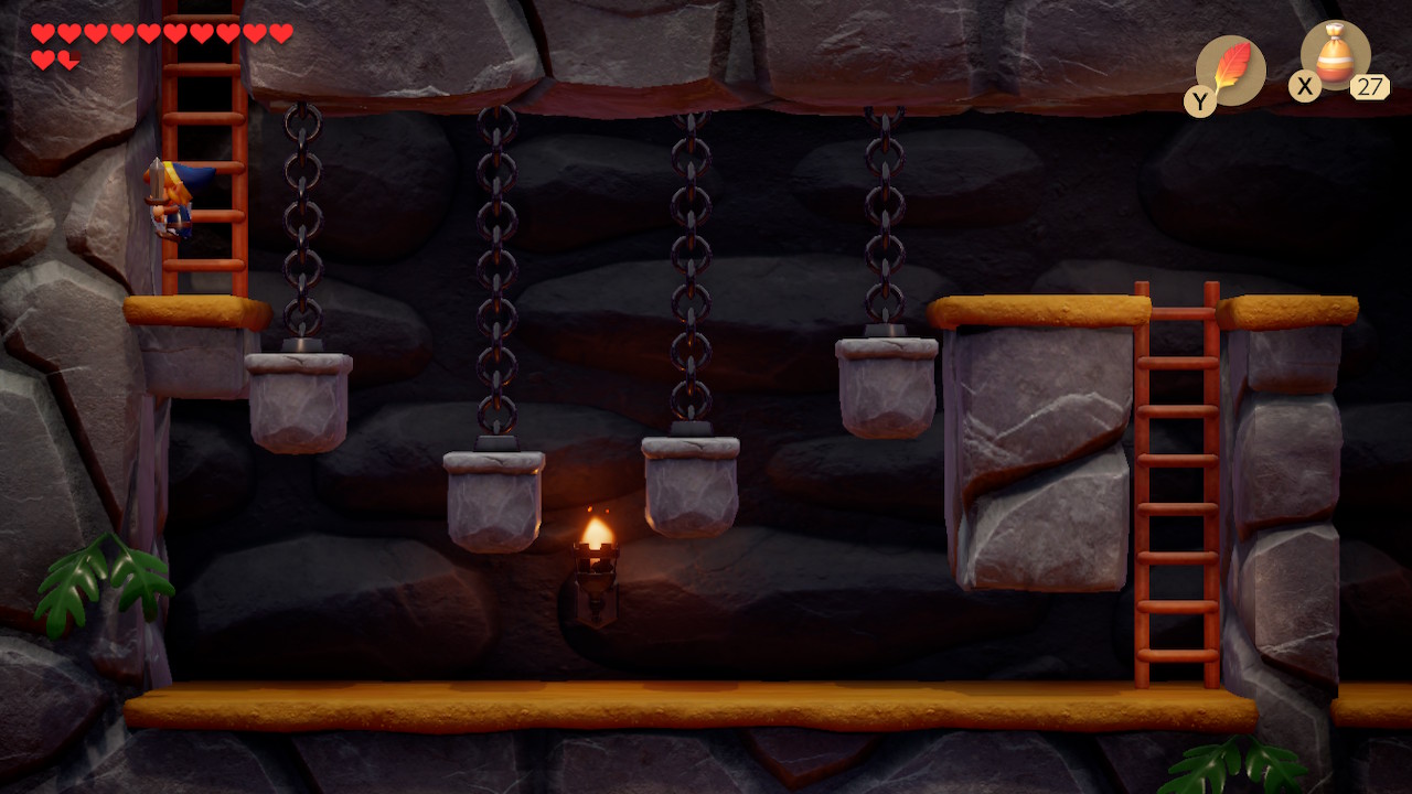 In the 2D basement, there are stone platforms suspended by chains. There is a pulley-like system, so as one moves down the other will move up. Time your jumps well to make it across and head up the ladder to the left. Defeat all the enemies and smash the crystals in this room. Push the two blocks towards each other to form a square and a Small Key will drop.