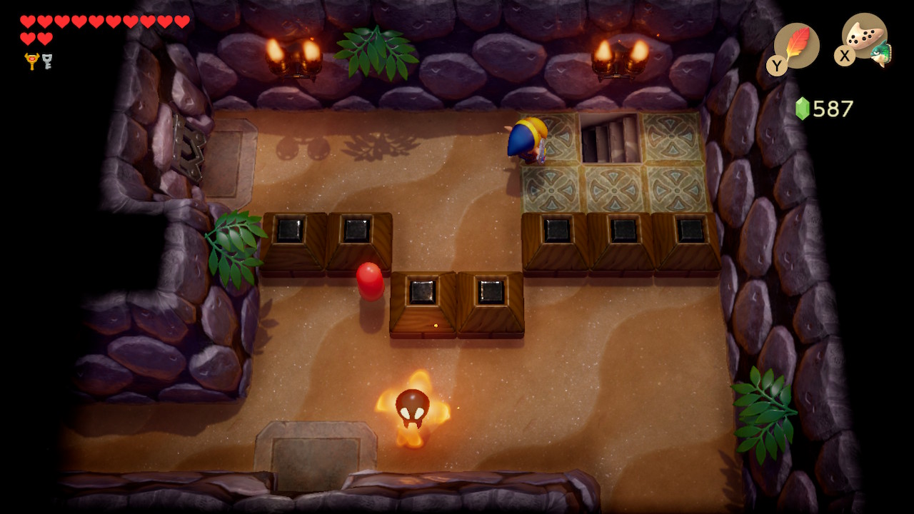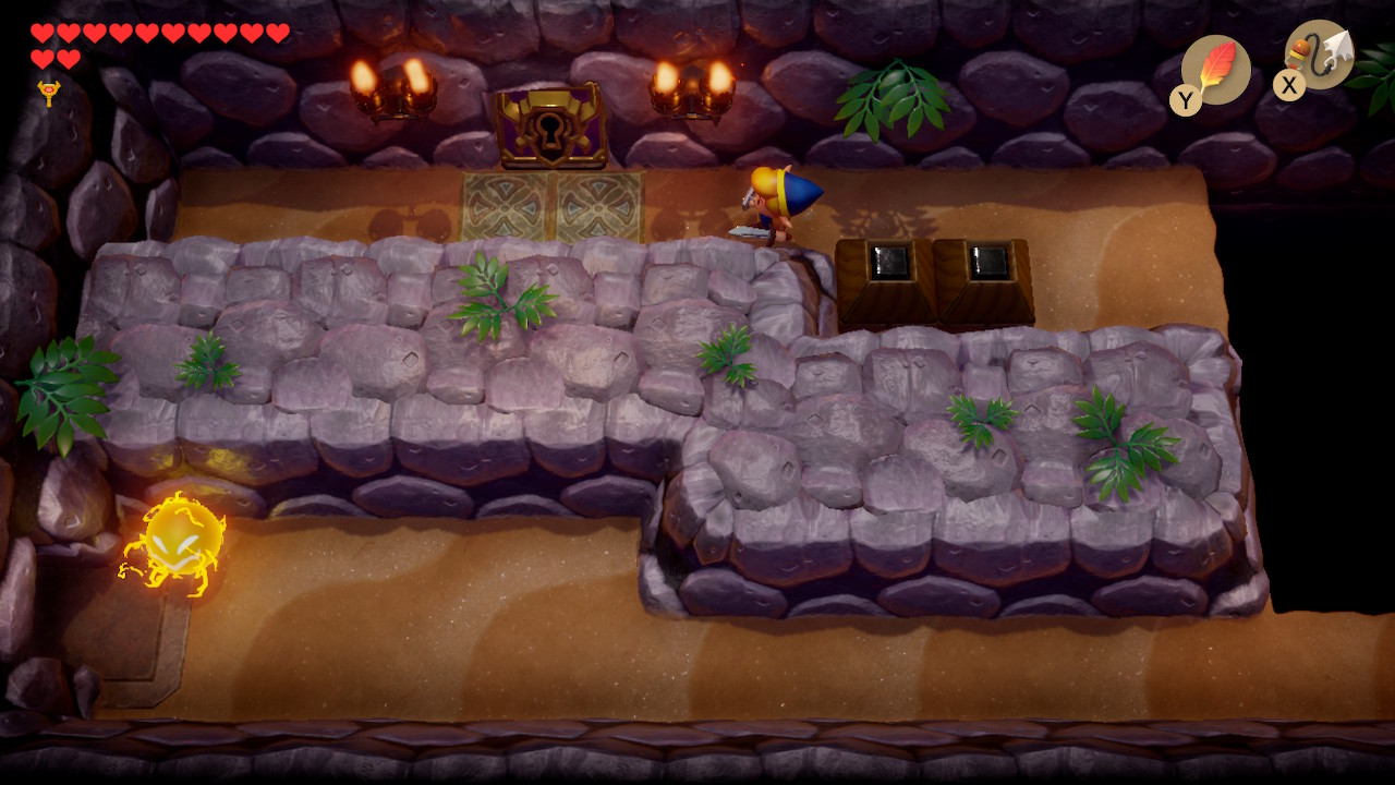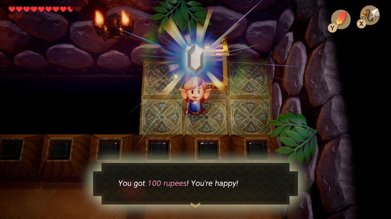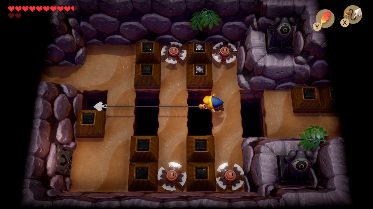 Play Manbo's Mambo again to get to the entrance of the dungeon. Head left two rooms, and then take the narrow northern path to go right. Use your new hookshot to latch onto the chest on the opposite side of the gap. Open it to get 100 rupees. You can also latch onto the blocks to get back to the other side. Exit to the left and head up to the next room.