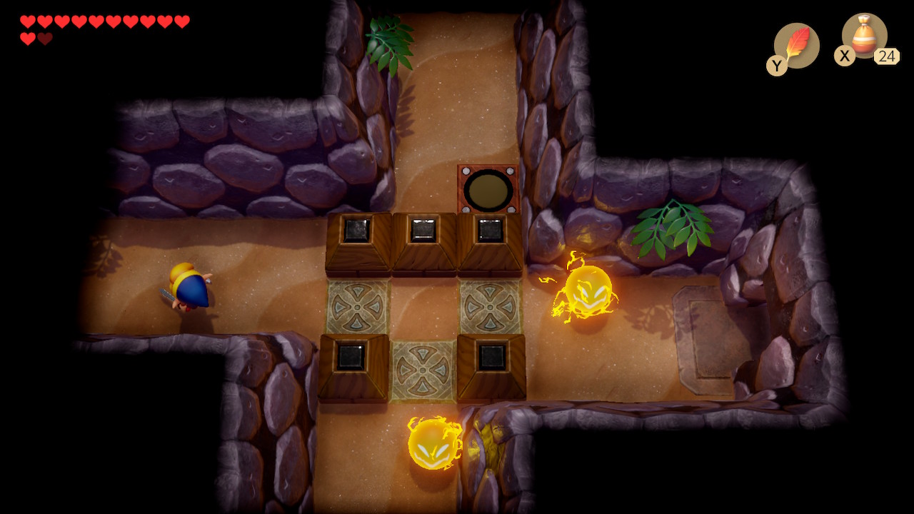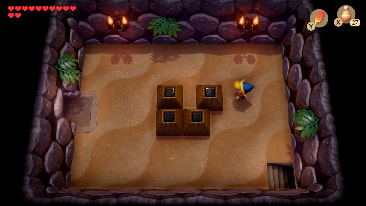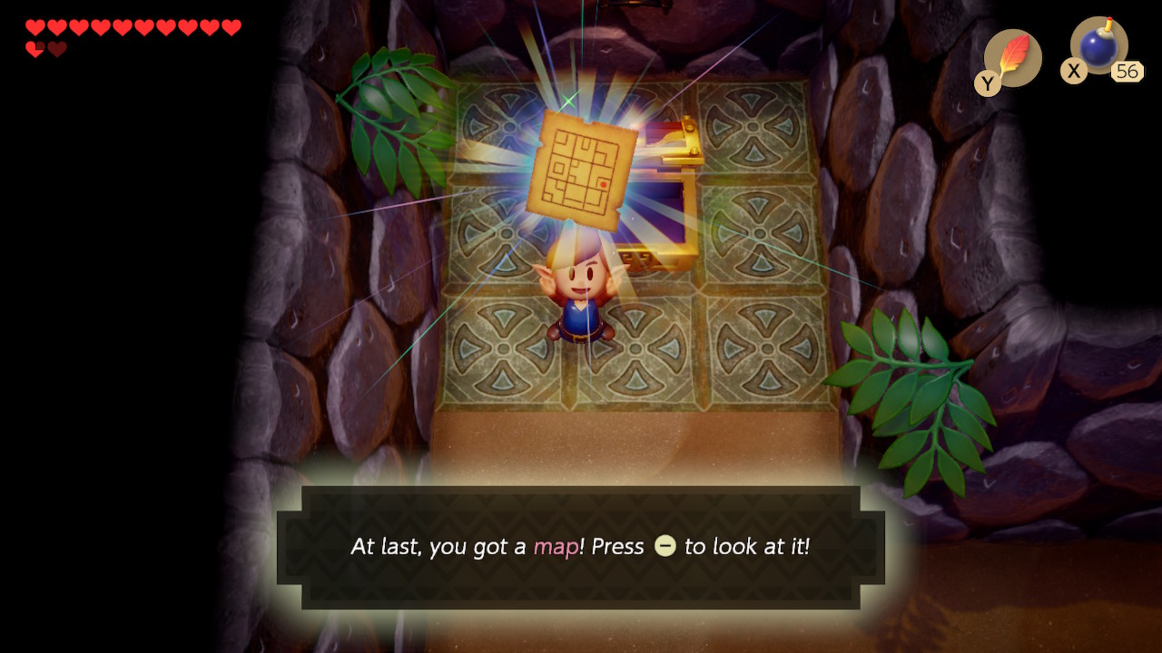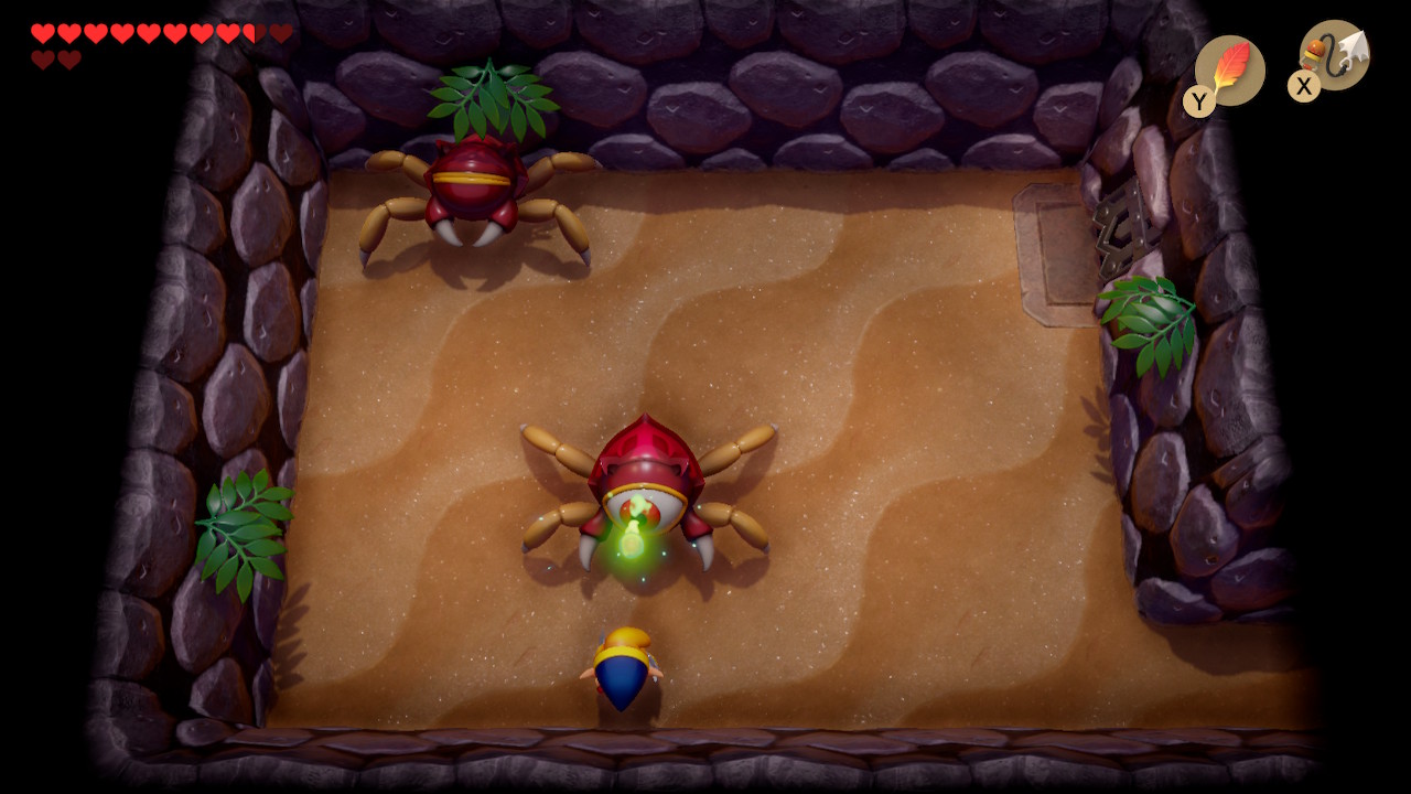 Play Manbo's Mambo again to get to the entrance of the dungeon. Head left two rooms, and then take the narrow northern path to go right. Use your new hookshot to latch onto the chest on the opposite side of the gap. Open it to get 100 rupees. You can also latch onto the blocks to get back to the other side. Exit to the left and head up to the next room.
