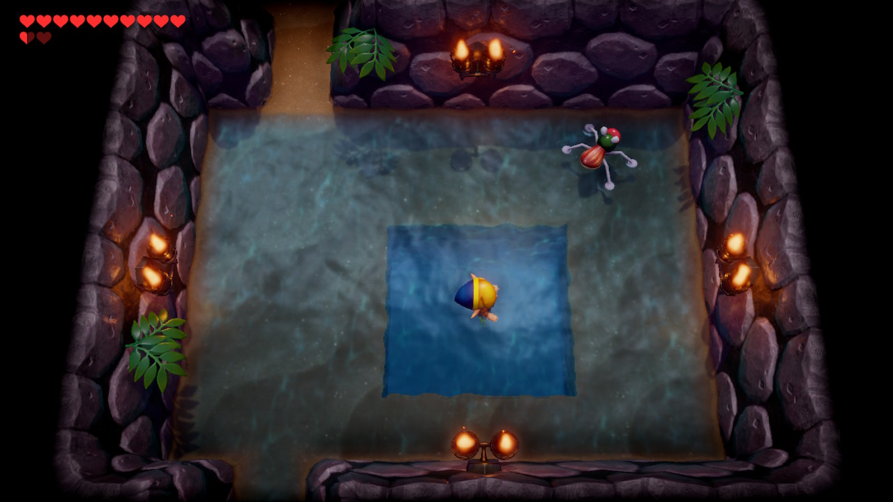 Play Manbo's Mambo to return to the entrance of the dungeon. Now, take the warp portal to the room where we defated Gohma before. If you chose to skip this mini-boss, use the room with the central block and head right, continuing through an underwater area. Use your map if you get stuck. From Gohma's room, use the top right exit and go down the stairs.