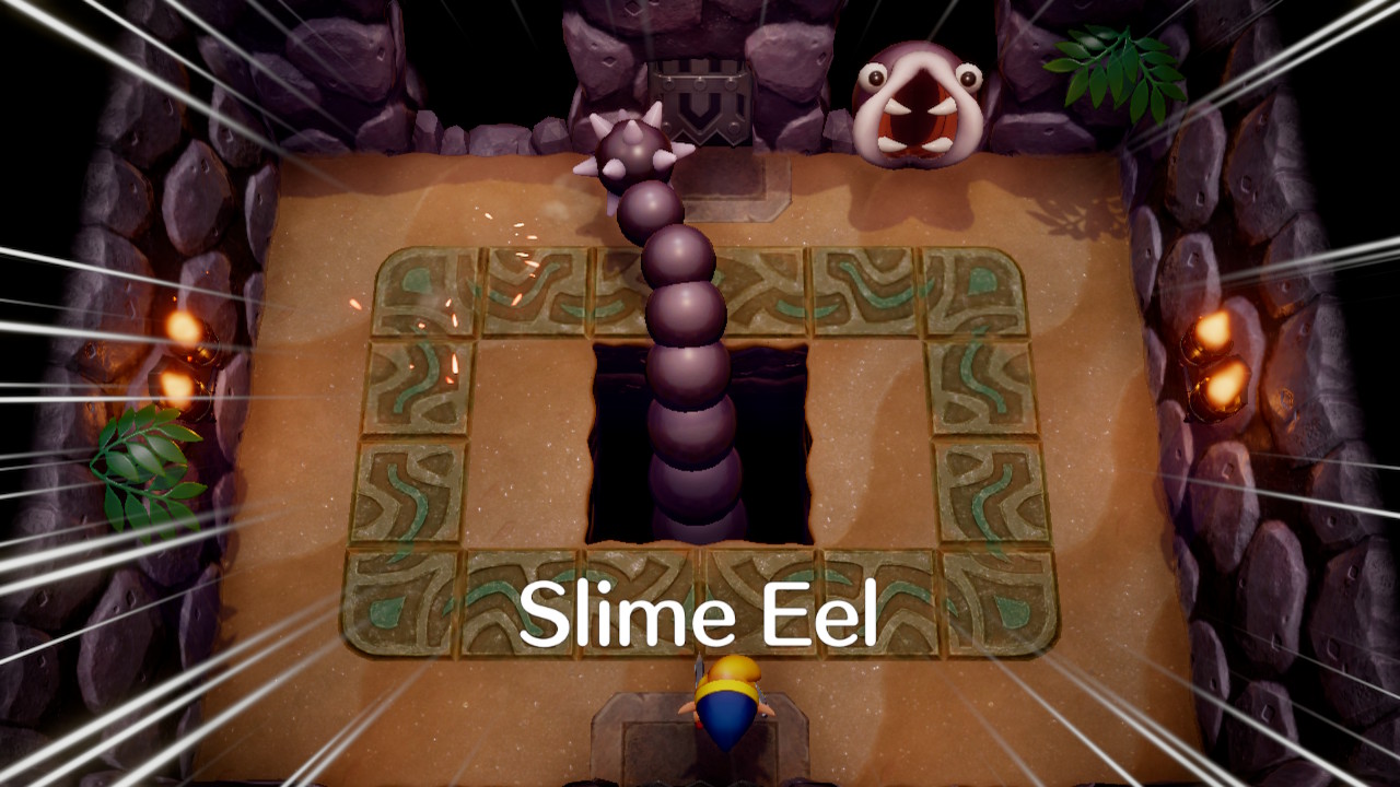 This boss is the most tricky so far, it'll take a lot of patience since you'll need to be quick when Slime Eel opens his mouth to use your hookshot, and his tail can get in the way. After enough slashes, he'll be defeated and leave a Heart Container behind. Enter the room above and grab the next instrument: the Wind Marimba.