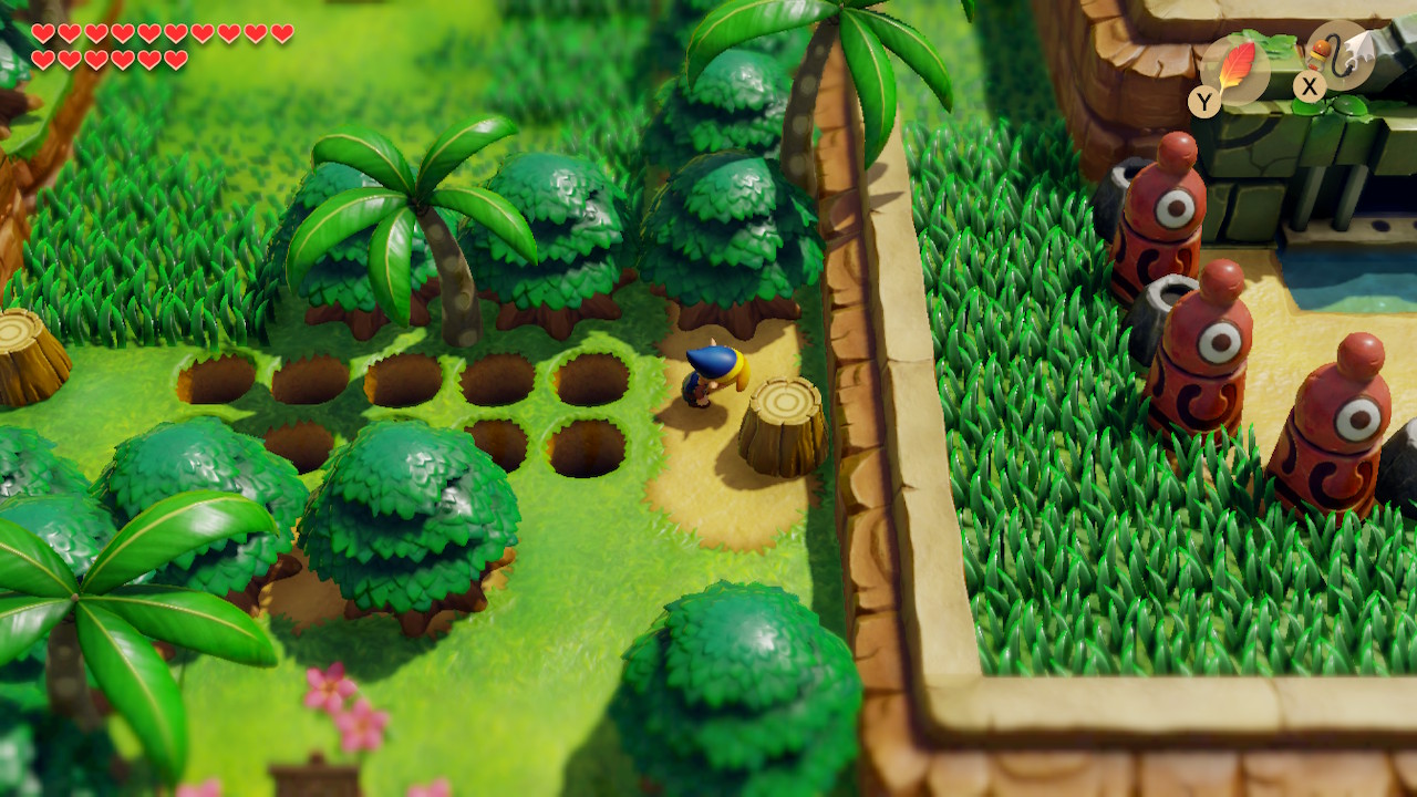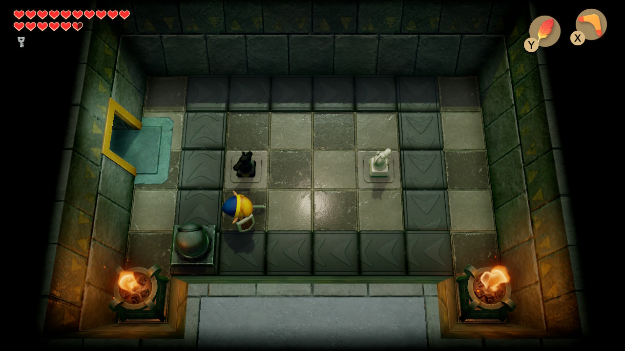 This room has a beamos, whose lazer can now be reflected to defeat it. A new enemy that resembles Kirby (called Anti-Kirby) can be found here as well and can be defeated with the boomerang or bombs. Head left and go up the stairs here. It's time to play chess again in this room. Remember the L-shaped rule, and toss the pieces until they land in the holes. Open the chest that appears to get the Map.