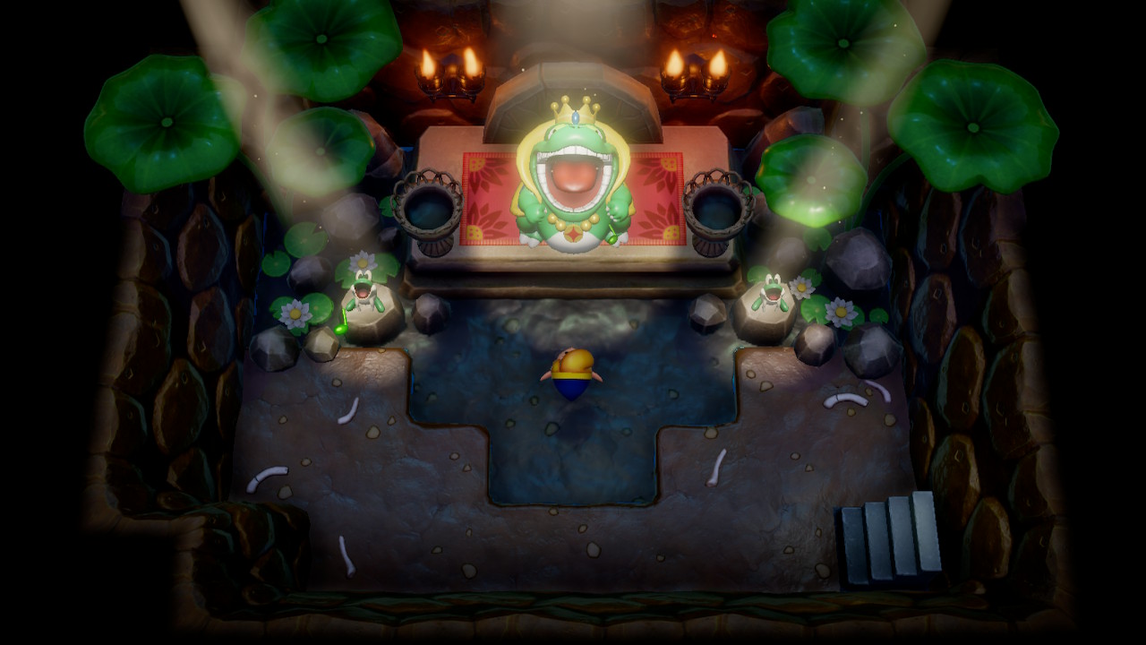 Head up to the next room. You'll want to whack the crystal switch here once (turning it blue) and push the two blocks together. Inside the chest that spawns is the Nightmare Key. Backtrack down a room and left past some Goombas until you find the boss door. Use your newfound key on it and head through it.