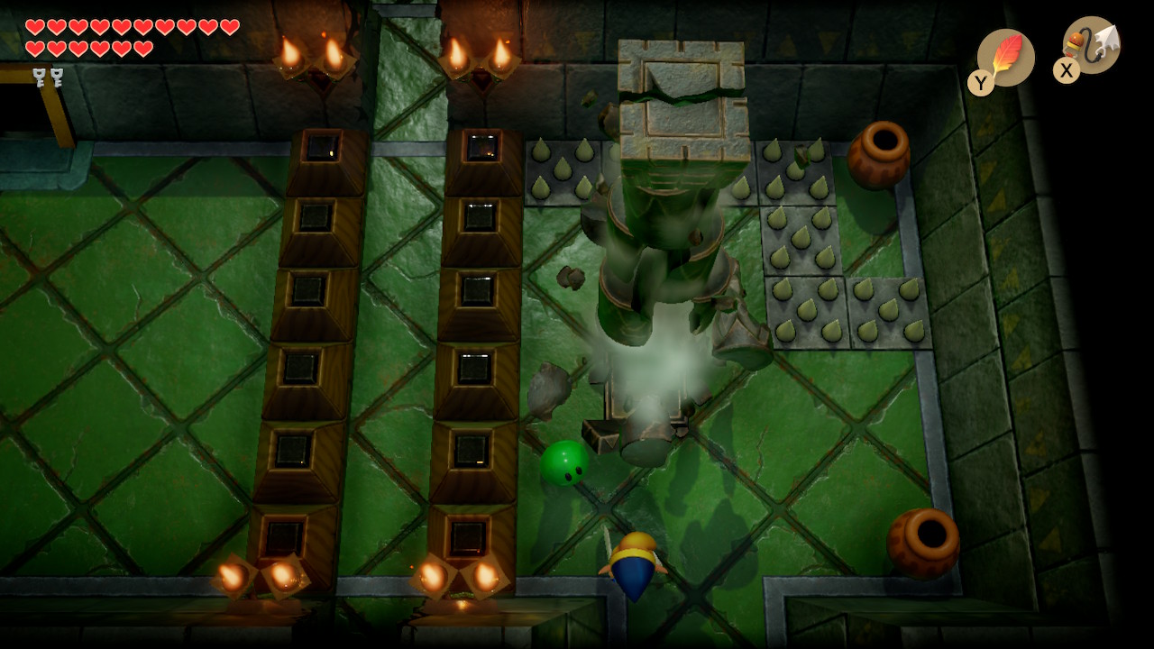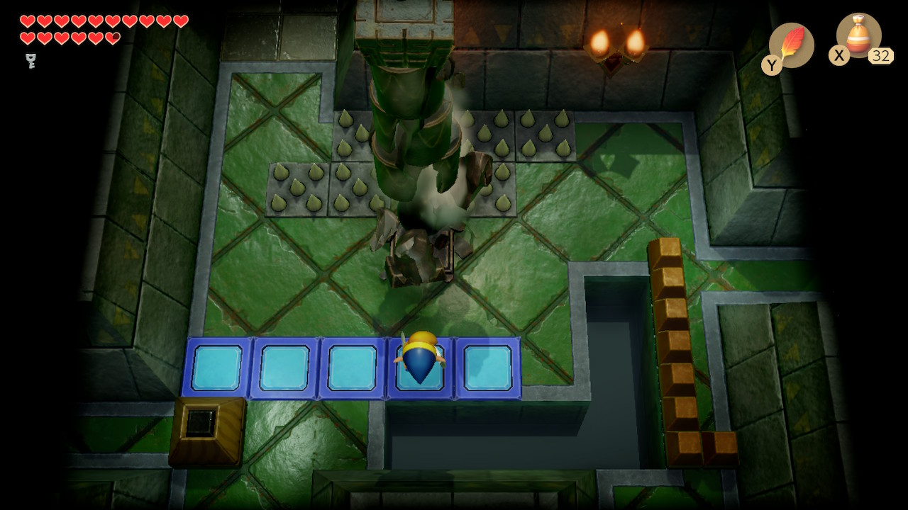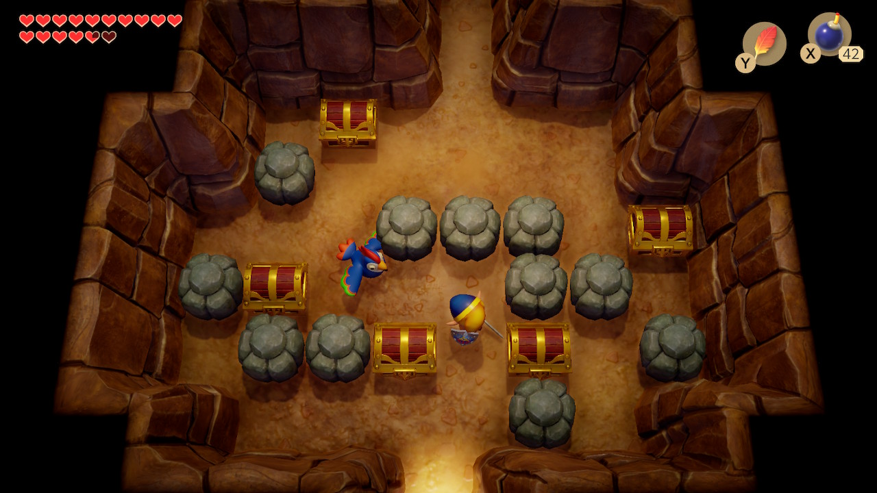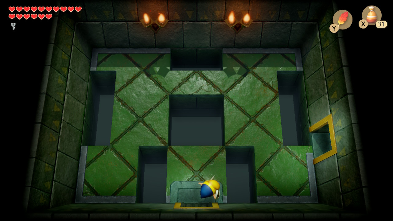 You'll find yourself on the narrow ledge on the left side of this floor. Head up a few times and you'll find a chest that contains Secret Seashell #48. Hop off this ledge and head back up the stairs and make your way back to the mini-boss room. Head right from here. In this room, match the suites on the three enemies to make a chest appear that we can't reach yet.