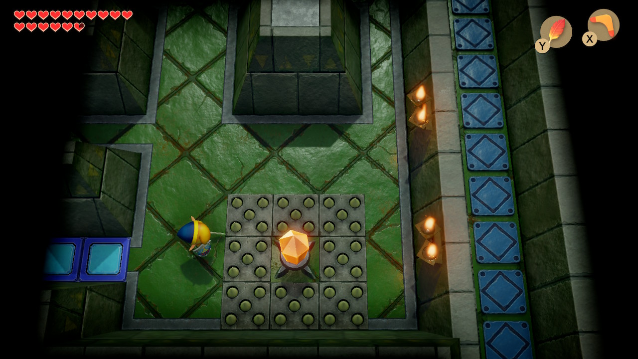 Head up the stairs here, as we can't cross to the left yet. Head up through the lowered orange blocks. Pull back the level on the right side of the room to spread the blocks apart so you can quickly head to the left. Leap into the pit in this room to fall to the floor below. In this room, follow the path of the lowered orange blocks as far left as you can, and then down. They'll lead you to a chest containing the Stone Beak.