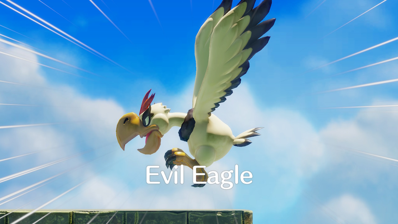 At the top of the tower, you'll run into the Grim Creeper once again. This dungeon's boss Evil Eagle, will swoop down and the Grimp Creeper will hop on for a ride. This is one of the more interesting boss fights in the game. He's got a few different attacks he'll use on you. He can come swooping in at a few different heights, which can be blocked or slashed for a counter-attack. He'll also hover above at a diagonal and shoot feathers and wind at you.