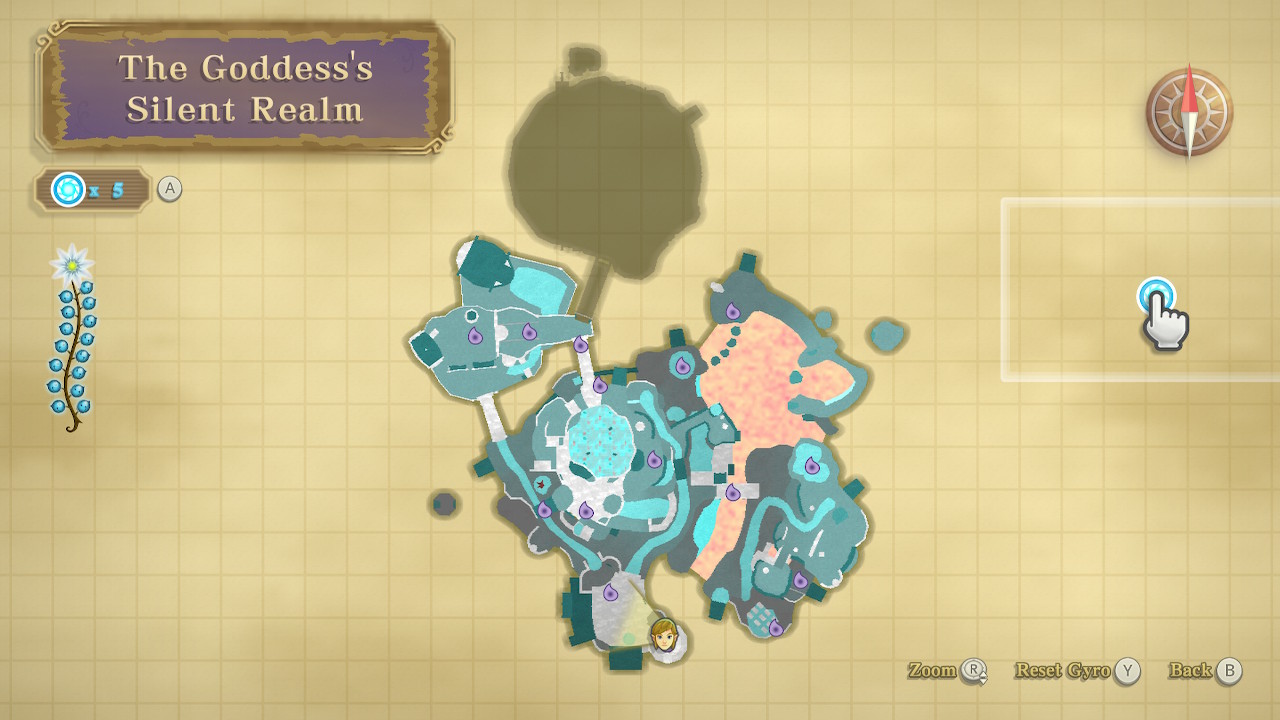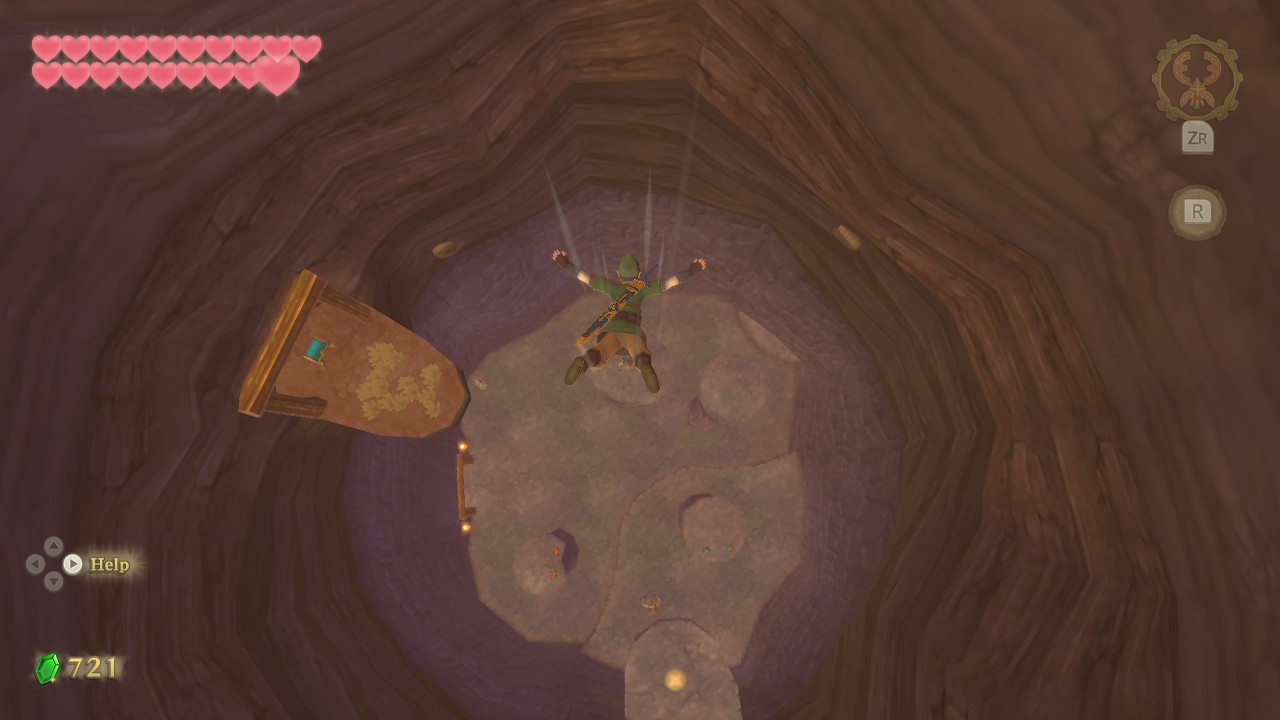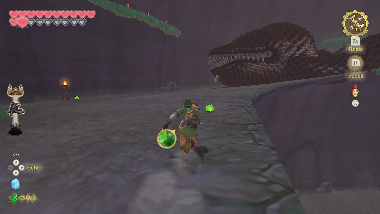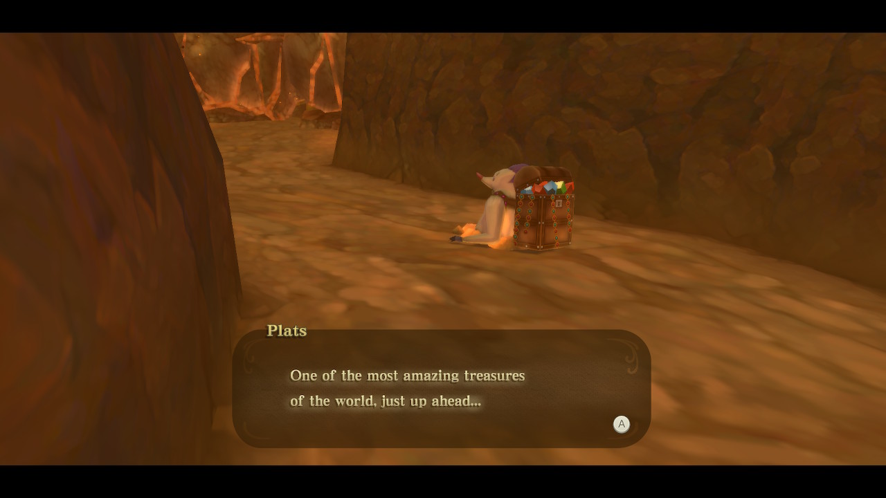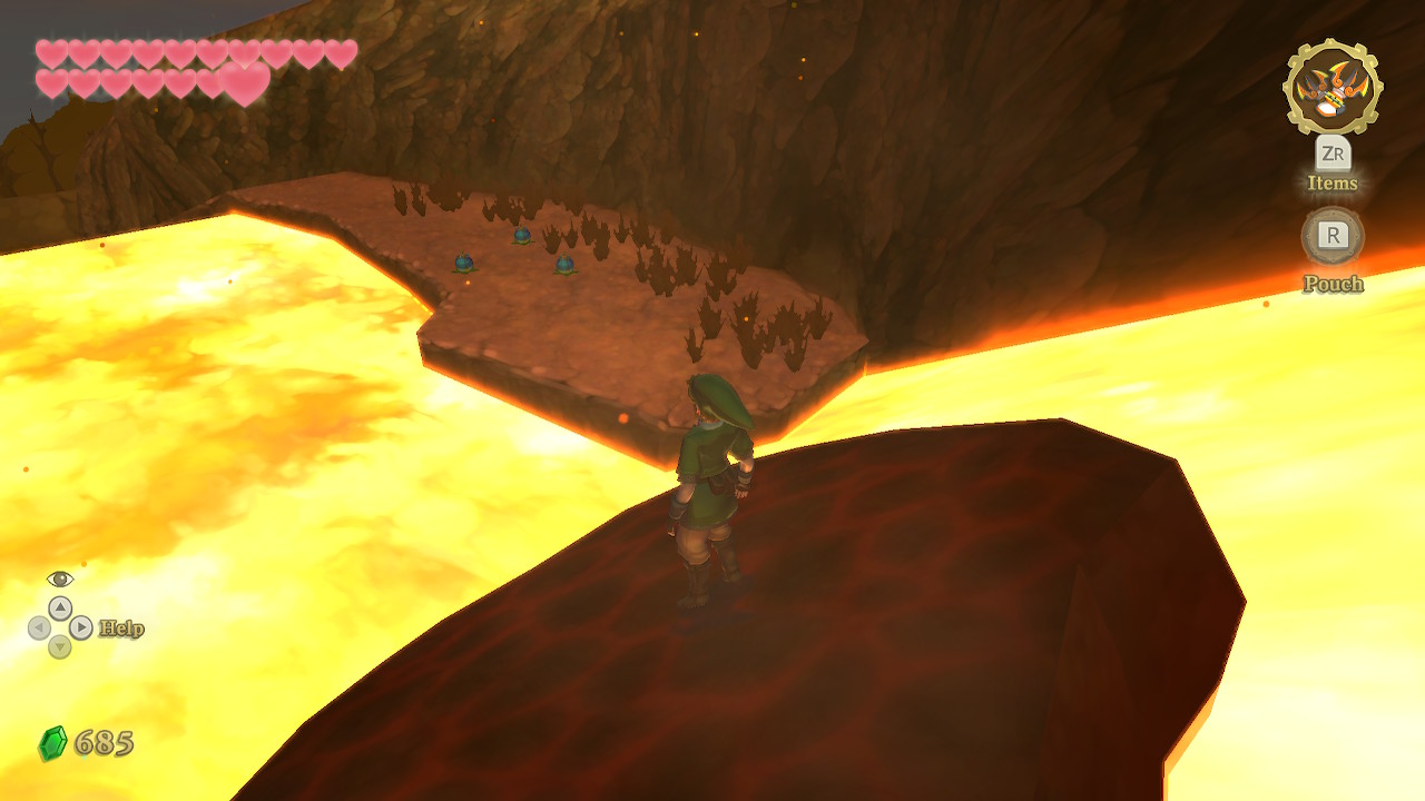 Here you'll find the Mogma Guld, who is looking for a place to work that isn't so hot. Fi will call Scrapper down who will bring Guld back up to the sky. Climb up the ledge to the south to find a large air stream that will take you back up to the volcano. Use a nearby bird statue to return to the sky.