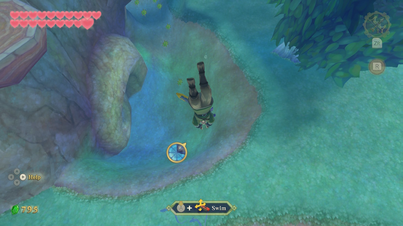 After collecting all 17 Groups of Tadtones, we want to return back to Faron. Swim to the entrance at the bottom of the tree. While swimming back up, you might notice some cracked boulders. You can use a nearby Froak to blow one up and collect 40 rupees if you'd like. Swim to the top of the tree and get on solid ground.
