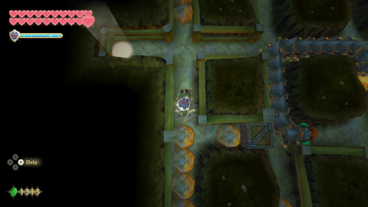 Continue forward and you'll come across a Bokoblin tower with a light shining around it. You'll of course want to avoid this light or you'll be caught. Dig in the nearby soft spot and crawl straight forward, ignoring the Moldorm down here. Emerge from the other side and climb up the ledge. Open the chest here to get back your Gust Bellows.