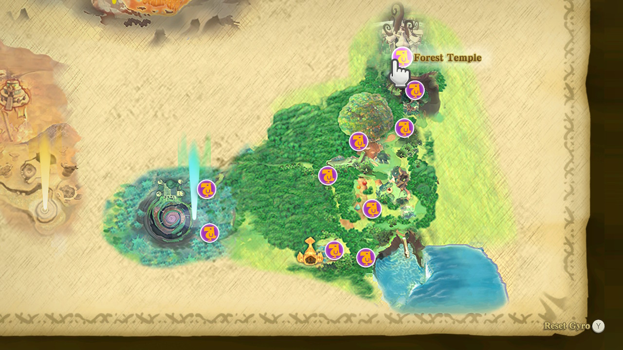 Afterward, use the air streams to make your way back to the Sealed Temple. Speak with the Old One and Groose here to learn that Faron Woods, our next destination, has been flooded. The only way to enter is to have Groose fling you over the gate in his catapult. Exit the front doors of the temple and hop into the catapult to enter the Flooded Woods.