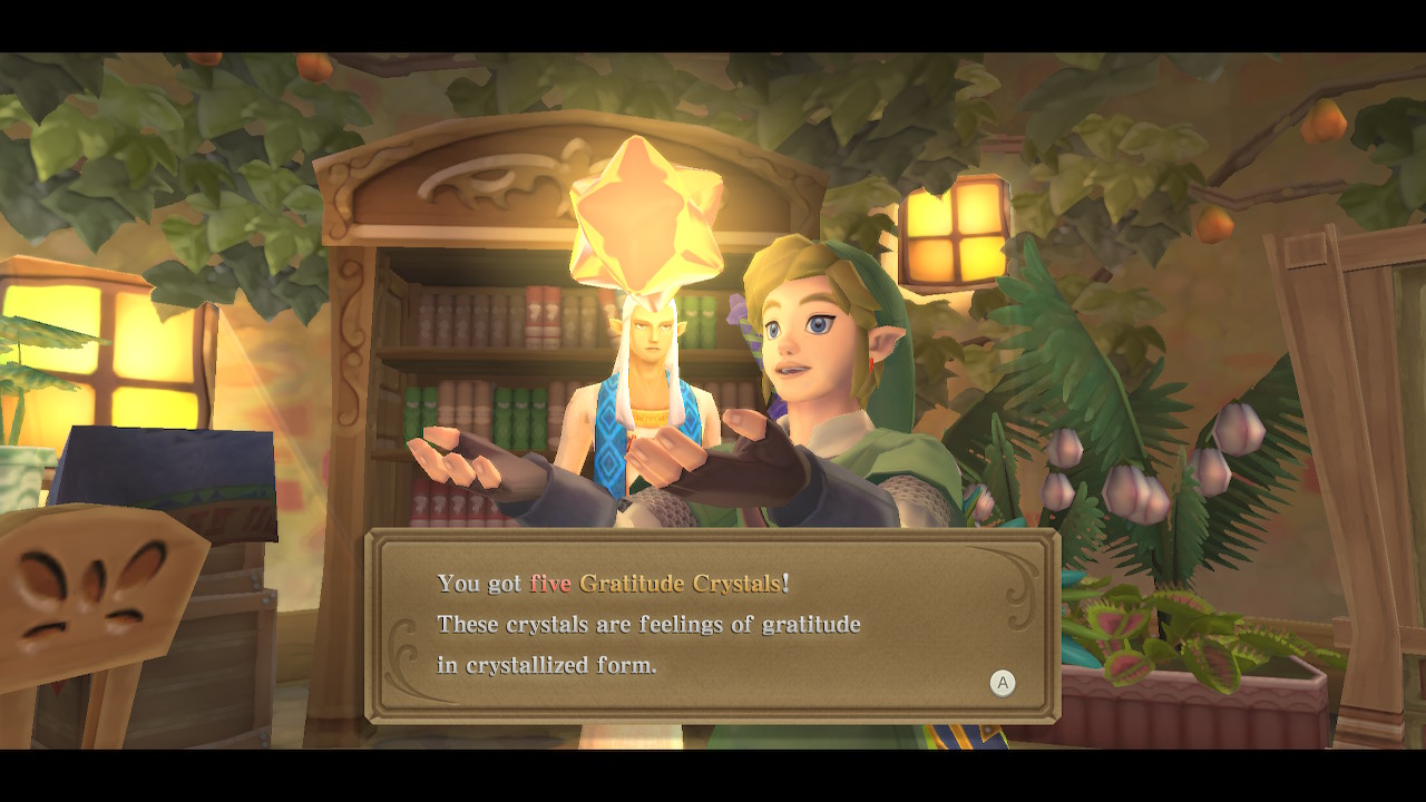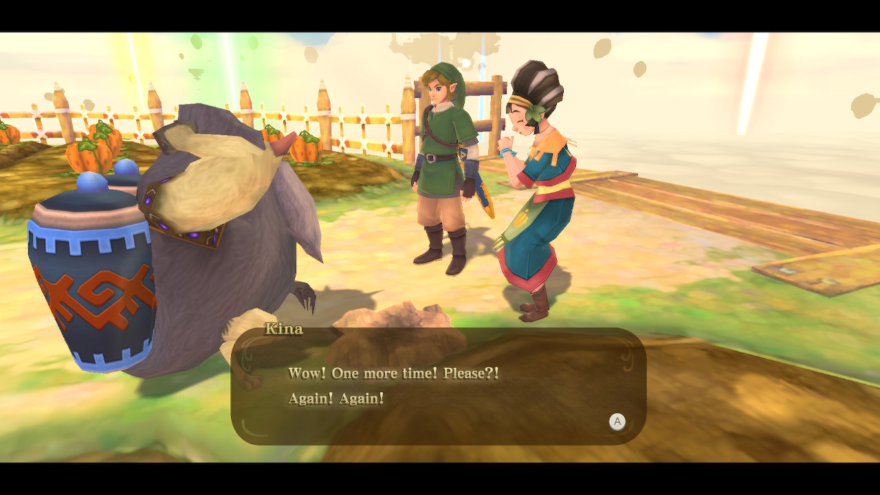Fly back over to Pumpkin Landing. Head back to the pumpkin patch and Scrapper will drop off Guld. They will agree to work together, and Kina will of course reward you with the customary 5 Gratitude Crystals. From here, fly back to Skyloft.