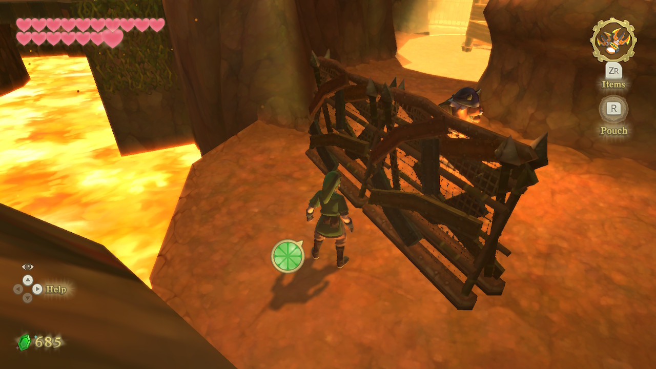 Use your clawshots on the nearby Peahats to get back to the top of the lava falls. Once up here, continue to the left a bit into the area with a lot of Bokoblin camp stuff. There is a Bokoblin blocking a narrow entrance to the path ahead. You'll want to hide behind the wall, charging up a slingshot shot. As soon as he looks away, shoot him and quickly run past him.