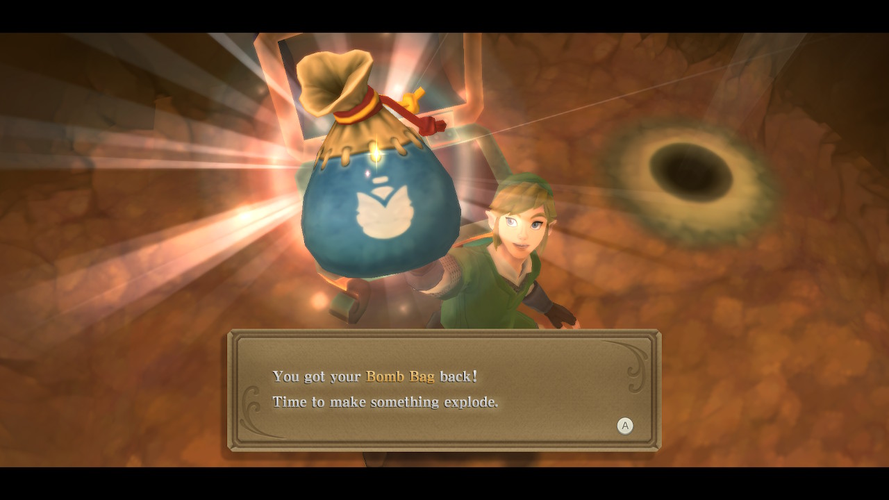 Once underground, use the nearby bomb to blow up the rocks blocking your way. Then emerge via the light. You'll be inside a small gated area with a chest. Open it to get your Bomb Bag back. Dig at the soft spot to create a small air stream which you can ride up to a higher platform. Fill up on bombs at the flower here.