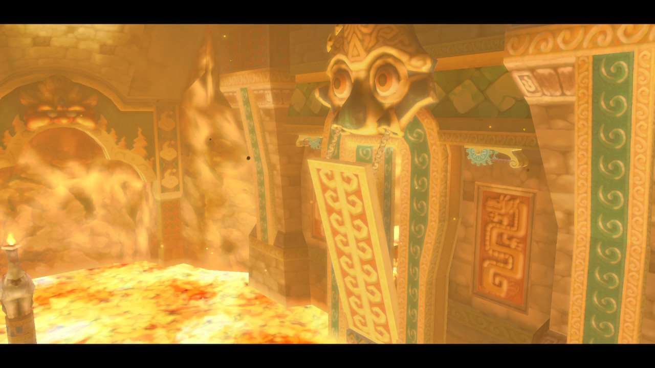 Climb up the two ledges to the west and blow up the boulder that blocks your path. Slide down the sand slope and head left back into the room with the large lava pool. Use the moving platforms to get to the other side once again (activating the Goddess Cube if you missed it before). Climb up the stairs and enter the next room.