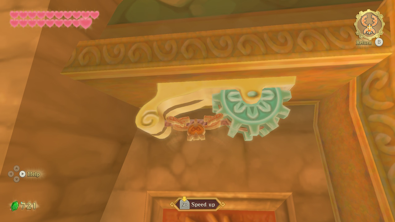 Directly to the right, you'll find Goddess Cube #27 to activate with a Skyward Strike. This is the final Goddess Cube! Return to the central area along the same sandy path. There is only a bridge to cross back in the past, so use your beetle to hit the Timeshift Stone on the mine cart. Then return to the bird statue on the center platform and take to the sky.