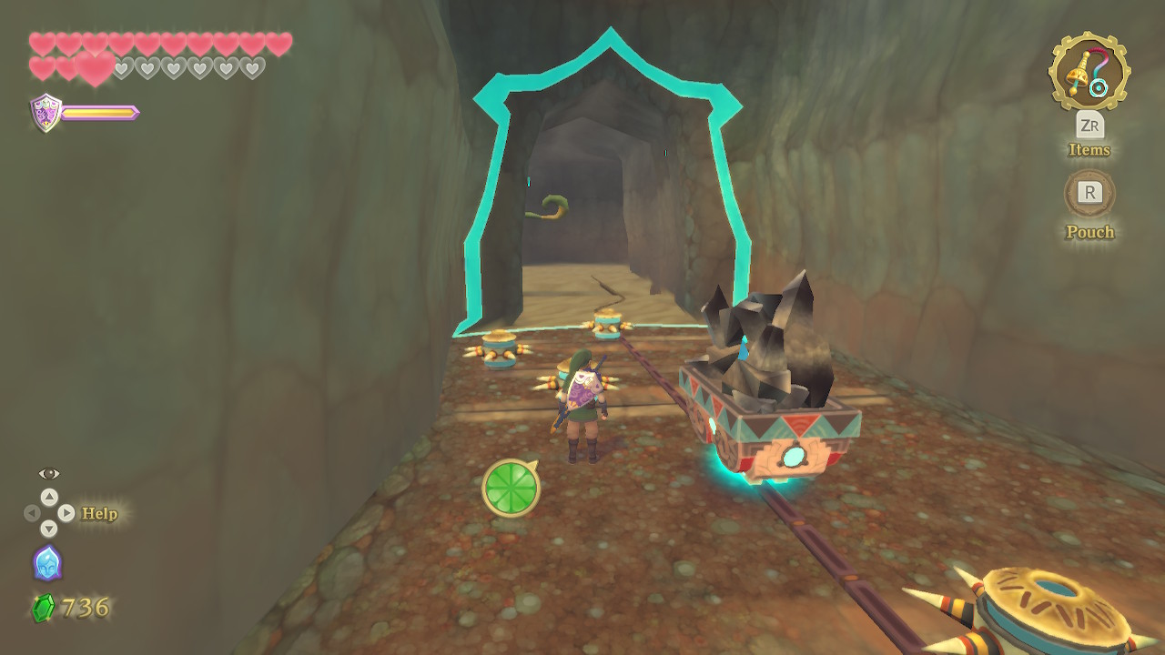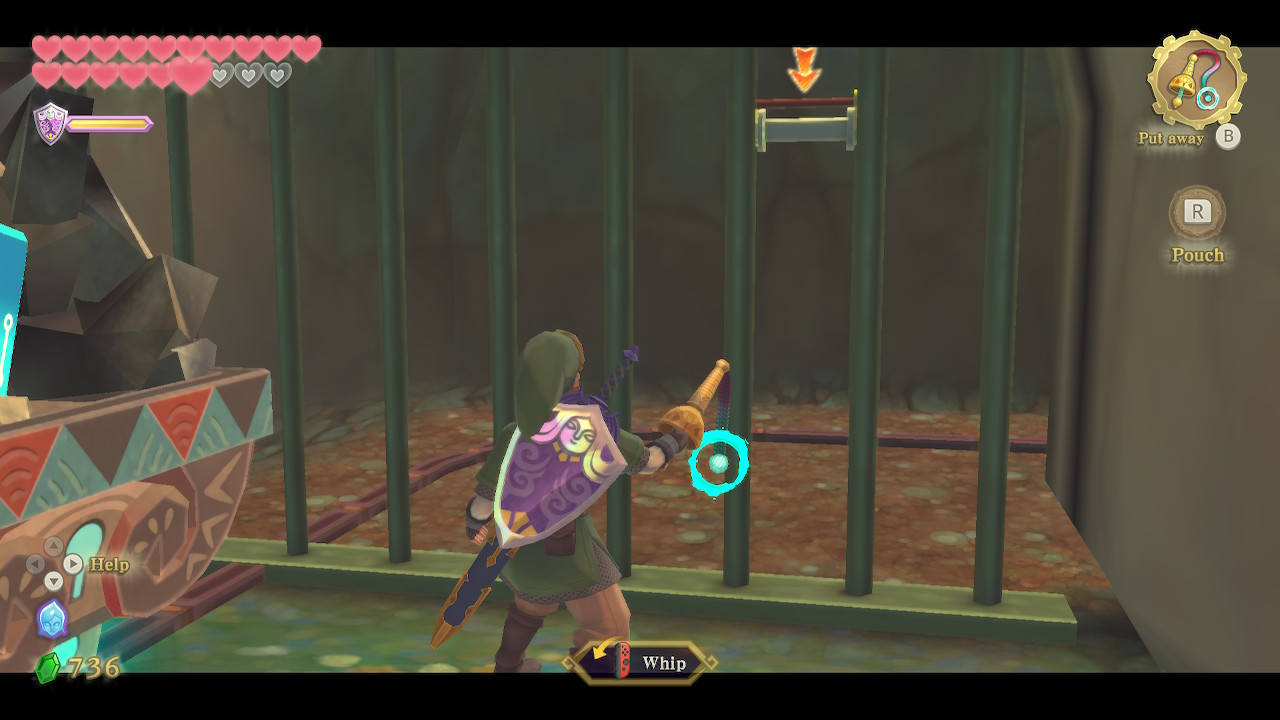 Once the cart is stopped by a door again, clawshot across to a target that will lead you to a floor switch. From here, you'll need to clawshot across a series of targets as they get activated and to a patch of vines at the end of the cave. Defeat the enemies in the next room and then use your whip to open the gate blocking the cart.