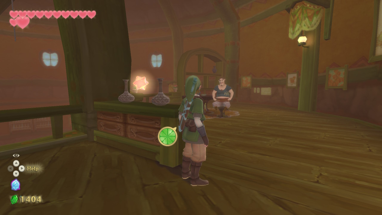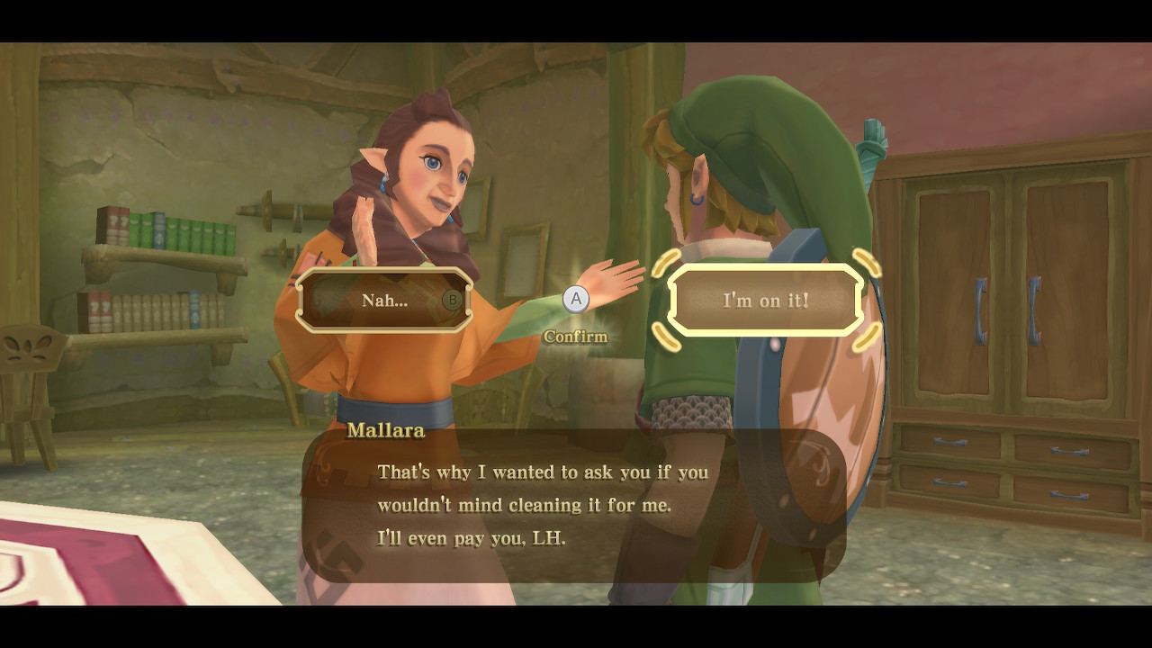 When you are back in Skyloft, head over to the east side to Pipit's House. His mother Mallara will be here, and if you speak to her she will offer to pay you to clean her home. We are now equipped with the gust bellows, so this should be easy.