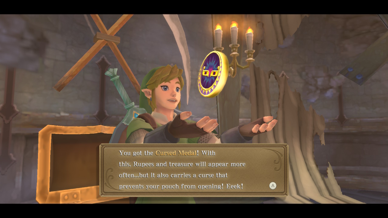 Now that we have 30 Gratitude Crystals, we can get a reward from Batreaux. Head over to the Graveyard and take the path through the shed to Batreaux's House. Speak to Batreaux and you will get the Big Wallet, which holds 1000 rupees. If you've been following along that brings our total to 1900 rupees. A chest will also appear (that Batreaux begs you not to open) that contains the Cursed Medal. This will increase the number of rupees and treasure you find but will leave you unable to open your pouch.