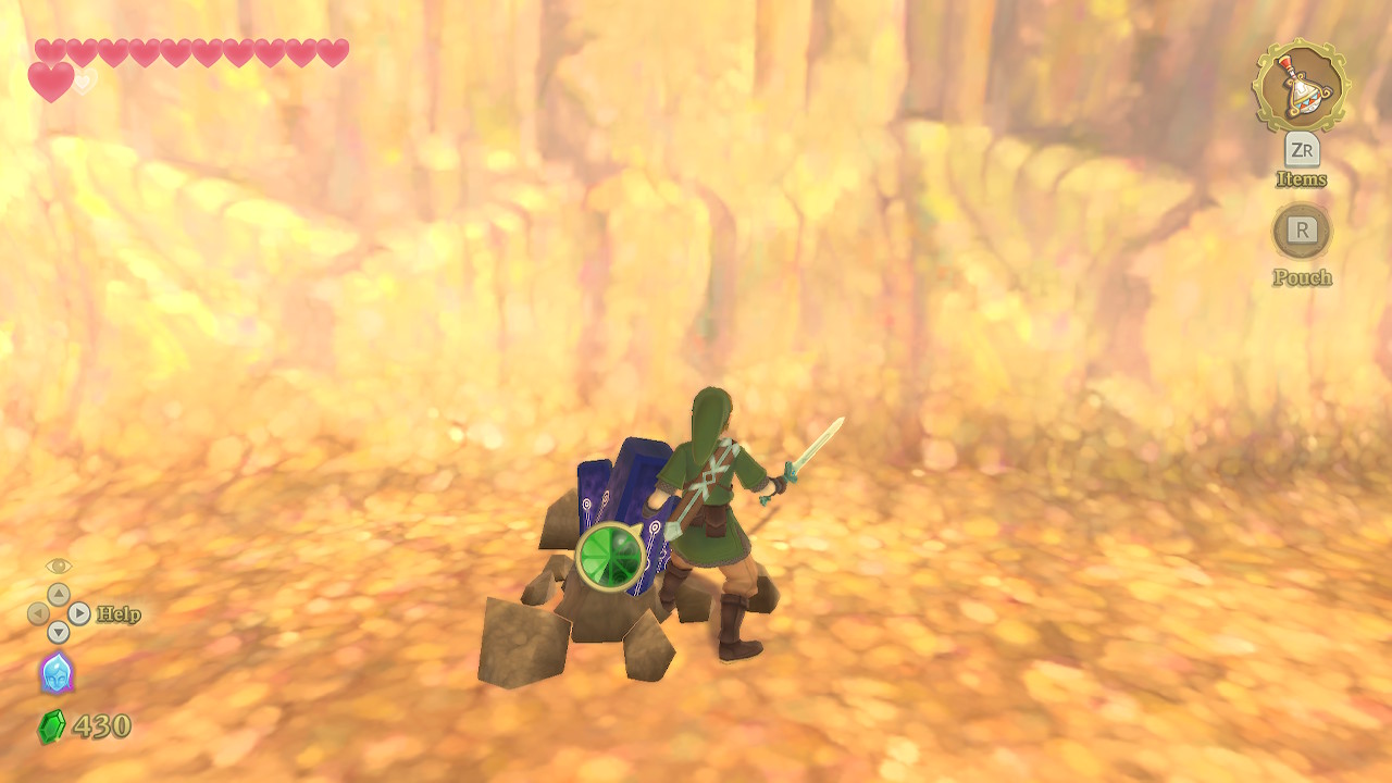 Head out the main doors of the temple for an optional cutscene with Groose, who is beating himself up. Now go back out through the east doors of the temple where you can speak to Gorko again. He has found a Blessed Butterflies spot, which if you play your harp at reveals a Gossip Stone. These little stones give tips and drop treasure when they are activated.