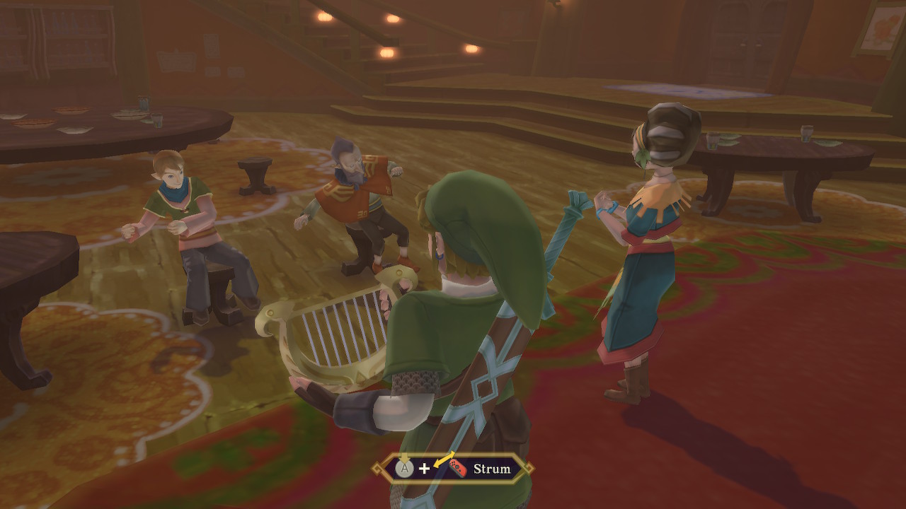 Head back inside and speak to Pumm again. The next job must be done at night, so use one of the nearby beds to sleep until then. Speak with Plumm again and he will have you play the harp with Kina. Strum along to the customers' motions and if you do a good enough job you will get Heart Piece #10 and your debt will be paid.